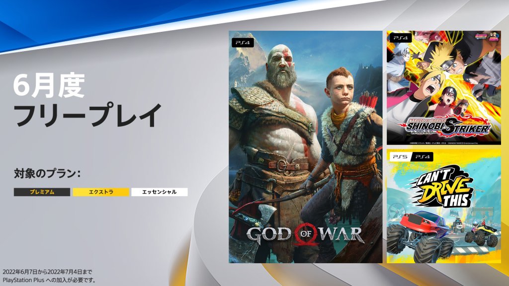 今月のフリープレイは『God of War』『NARUTO TO BORUTO シノビストライカー』『Can’t drive this』の3本が追加。